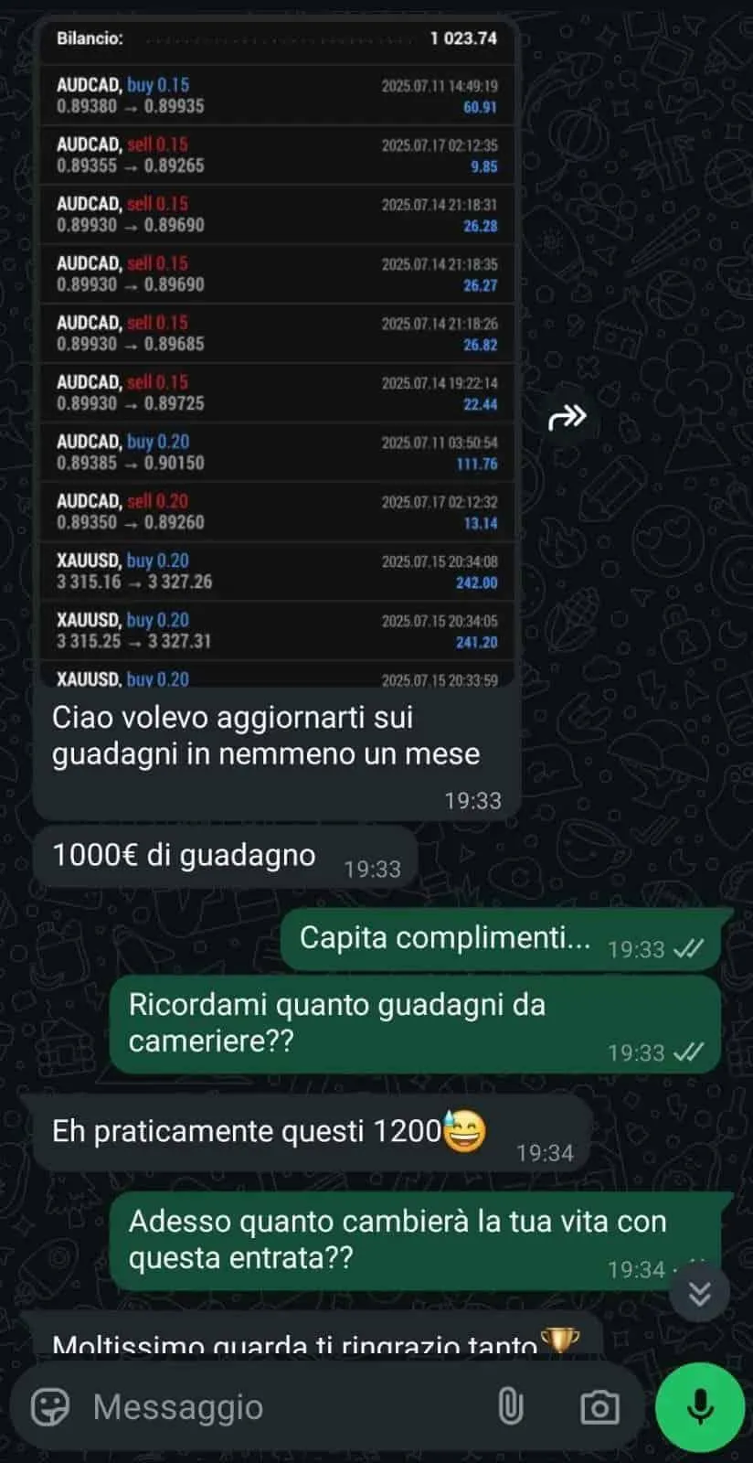 Eventuali riferimenti a operazioni di mercato, risultati passati, strategie operative o performance hanno scopo didattico e non costituiscono raccomandazioni finanziarie. Ogni utente agisce in piena autonomia e sotto la propria esclusiva responsabilità. I risultati passati non garantiscono risultati futuri. Le testimonianze riportate si riferiscono ad esperienze personali, soggettive e non verificabili in modo sistematico. I risultati variano da persona a persona e dipendono da molteplici fattori.